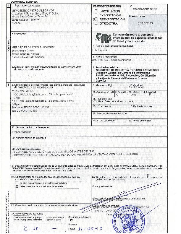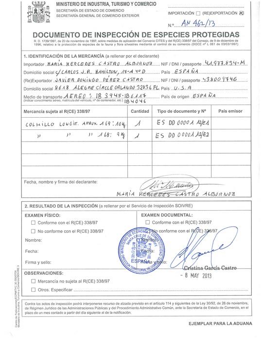 • Ministerio de Industria, Turismo and Comercio protected species documentation inspection – May 8, 2013