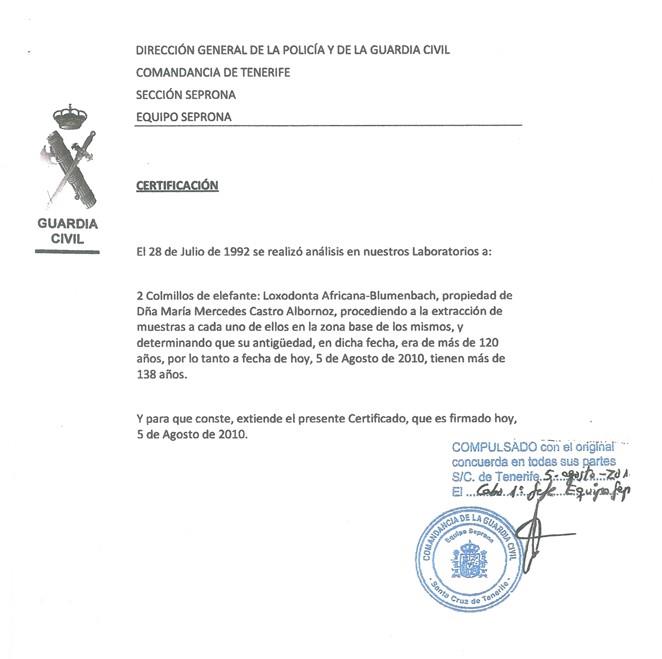 • Antiqueness Certification of August 5, 2010: in excess of 138 years